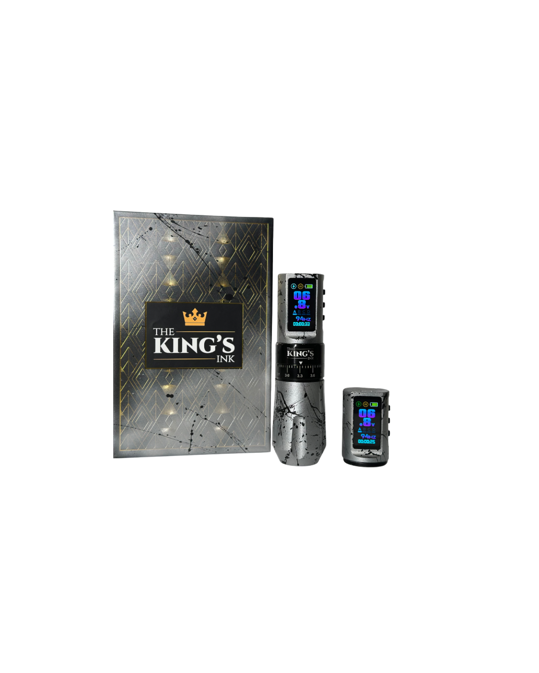 A máquina de tatuagem The King's Ink e os pacotes de bateria são cada um cuidadosamente inspecionados, montados e testados, usando um rigoroso procedimento de garantia de qualidade. Cada máquina receberá um cartão de Certificação de Qualidade que verifica todas as verificações e inclui o(s) número(s) de série de cada máquina.